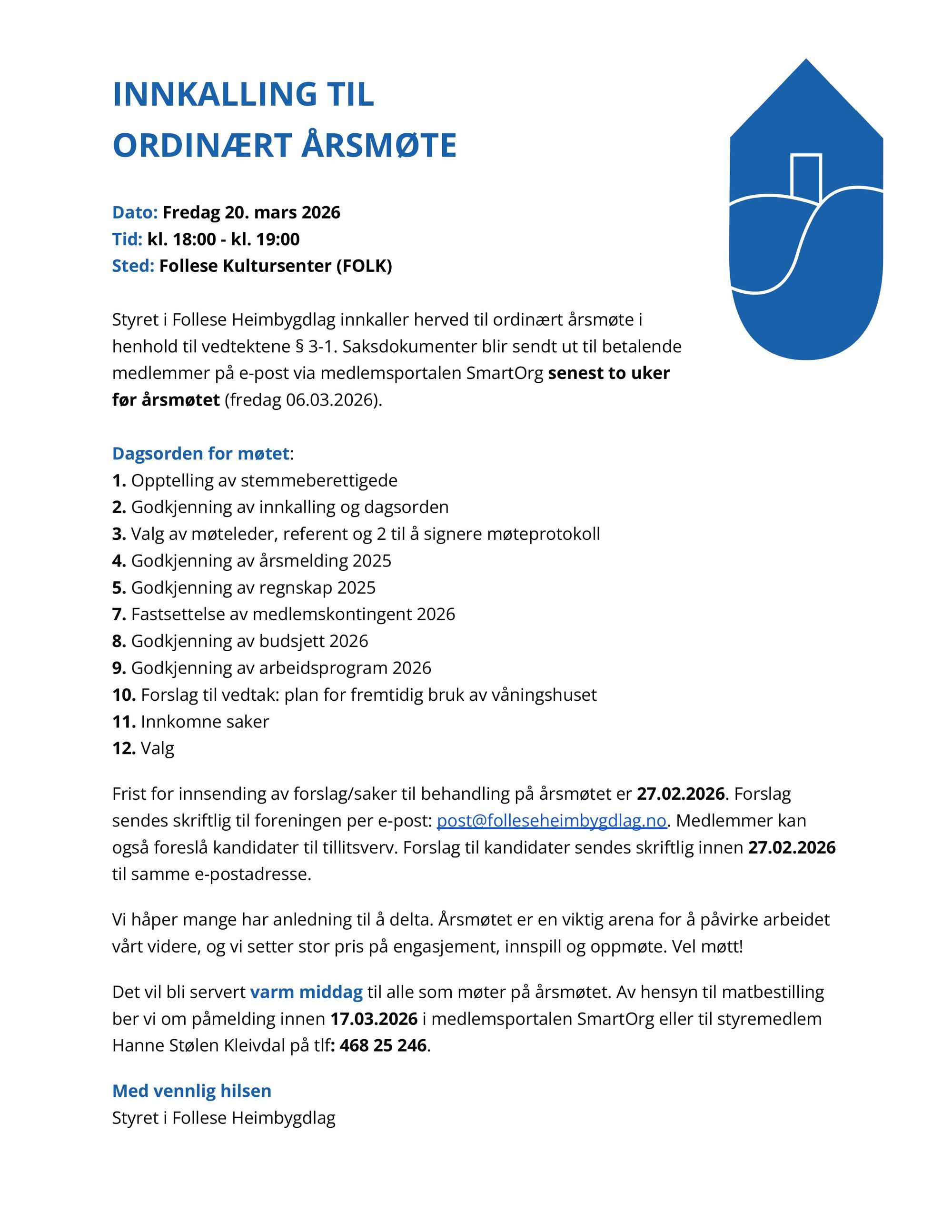 Styret i Follese Heimbygdlag innkaller herved til ordinært årsmøte i henhold til vedtektene § 3-1. Saksdokumenter blir sendt ut til betalende medlemmer på e-post via medlemsportalen SmartOrg senest to uker før årsmøtet (fredag 06.03.2026).